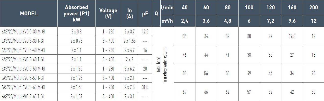 GRUP DE POMPARE - NOCCHI - EASY20/MULTI EVO 5 - TABEL DATE TEHNICE |