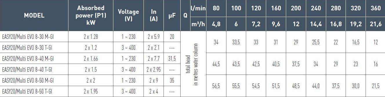 GRUP DE POMPARE - NOCCHI - EASY20/MULTI EVO 8 - TABEL DATE TEHNICE