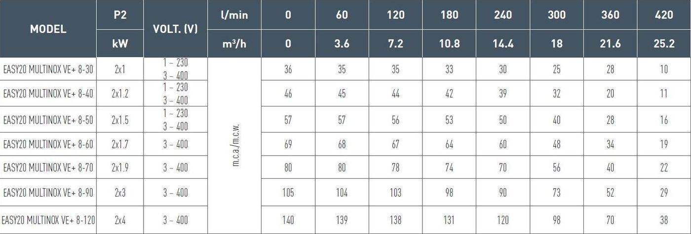 GRUP POMPARE NOCCHI - EASY20 MULTINOX VE+ 8 - TABEL DATE TEHNICE |