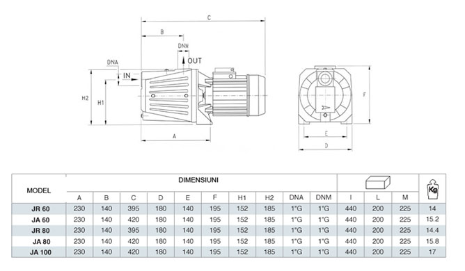-carcasa pompei de hidrofor este din fonta cu racorduri filetate aspiratie/refulare;-suportul motor din fonta;-etansare mecanica ceramica (grafit);-axul motorului hidraulic este din otel AISI 416;-rulmenti produsi de producatori de marca;-temperatura maxima a lichidului ce poate fi utilizat de pompa hidrofor JA este de 50 grd C, iar presiunea maxima este de 6 bar.