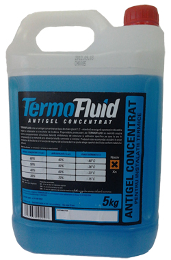 | Fluid termovector antinghet pentru protectia sistemelor de incalzire, in concentratie de 25-50% in functie de limita de inghet.Denumire chimica: Solutia apoasa de etilen glicol (1,2 - etandiol).Etilen-glicolul nu este inclus in lista substantelor periculoase din Anexa 2, H.G. 932/2004.Produsul nu este considerat toxic conform legislatiei in vigoare, nu este inclus în Anexa 1, H.G 697/2004. MOD DE INTREBUINTARE Curatati cu grija partile respective ale instalatiei, in conformitate cu normele în vigoare, cum ar fi UNI CTI 8065, 8364, 8884 (Tratarea apei în instalatiile termice). Daca e necesar, efectuaţt un decapaj al tevilor, pentru a elimina fragmentele de rugina sau de sudura. Preparati separat amestecul apa – antigel, amestecand antigelul în apa si nu invers. Introduceti amestecul în circuit prin punctul cel mai accesibil de langa pompa cazanului. Realizati circulatia solutiei in instalatie, funcţionand la rece timp de cateva ore iar dupa ce porniti cazanul, aerisiti instalatia.